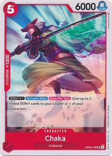 Chaka is a 5-cost 6000 power character that on attack if a DON!! is attached to Chaka you can move 2 rested DON!! to one of your leaders or characters. Now, in Vivi, a leader who cannot attack, of course this is not optimal. However, this is another example of moving rested DON!! To guarantee an attack toward your opponents. Chaka may have the Alabasta card type, but he serves as a valid option for other Leaders that touch Red within the OPTCG as a higher cost option to move rested DON!! around.