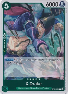 For 5 DON!! On Play X. Drake will K.O. a rested character with a cost of 4 or less and provides a 6000 power body. X. Drake does require your opponent have a rested character, but this is just a commonly used example of what Green can do while utilizing already rested characters.
