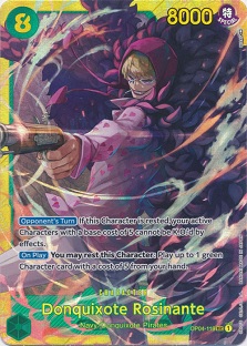 Rosinante is an 8-cost secret rare with 8000 power and both an On Play and during Opponent's turn effect. Rosinante plays more along the lines of protecting and putting characters into play. His On Play allows you to rest Rosinante to play a Green character with a cost of 5 or less from your hand, and on your opponent's turn your active characters with a cost of 5 or less cannot be K.O.'d by effects this turn. Rosinante provides a big body, protection for lower cost characters, and a way to cheat out characters with a cost of 5 or less.