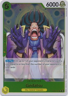 Gedatsu functions as removal but isn't as versatile, or as big of a body, as Katakuri. He can K.O. a character that has a cost equal to or less than your opponent's life. So the lower their life is, the smaller the character Gedatsu can hit.