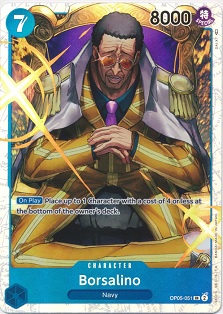Let's cut to the chase here with admiral Borsalino. Borsalino is a 7-cost 8000 power character with an On play trigger to return target character with a cost of 4 or less to the bottom of its owners deck. Not only is this a big body character, but it also serves as removal to get rid of threats on the other side of the board...