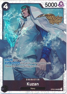 Kuzan currently see's play in Navy Perona builds alongside Moria decks with a navy package. However, even with replacing himself in hand he is hard to justify. His worst case scenario is a power 4 to draw a card and can easily be removed from the board with such a low cost.