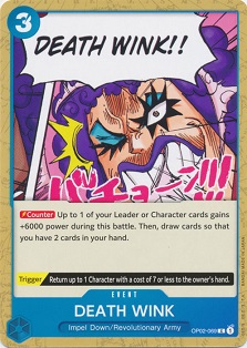 We are now entering the Top 3 with a Blue event, Death Wink. This is a 3-cost even with "[Counter] Up to 1 of your Leader or Character cards gains +6000 power during this battle. Then, draw cards so that you have 2 cards in your hand." along with a trigger of "Return up to 1 Character with a cost of 7 or less to the owner's hand." This event is currently seeing a lot of top play with Nami leader on the rise after months of debating whether the Seven Warlord package or Kuja pirate package would be best for the leader. With bigger threats such as Katakuri, Ace, and Gecko Moria present in the format, a higher power counter with draw potential has become vital. This event may not be searchable with Gloriosa or Sengoku, but Buggy certainly gets that job done. Regardless of how Nami has been built this even proves itself within its wide versatility of a counter, draw and potential removal.