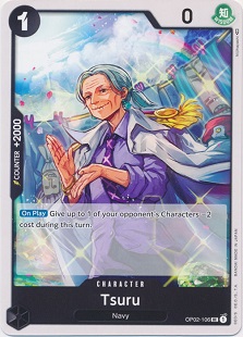 That being said, our number one slot is filled by none other than the loyal and tenured member of the navy, Tsuru! This card reads as something simple, but simple can be powerful. Tsuru is a one cost zero power character with +2000 and an ability of "[On Play] Give up to 1 of your opponent's Characters -2 cost during this turn.". Tsuru is a cheap to play character who, like Kuzan, promotes removal within Black and has a +2000 counter on her which is vital in any OPTCG deck no matter the leader or color. On top of being a cheap cost reduction and a +2000 counter, she is also a target for Gecko Moria to reanimate and reduce the cost so your opponent's characters can be more easily removed from the board. Tsuru is such a solid card that it is no wonder that she is still seeing lots of play today!