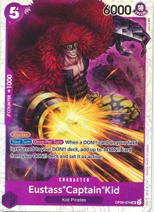 Next up, we have the aggressive and quick-to-attack fiery redhead, Eustass "Captain" Kid. Kid has proven to be a valuable character and blocker in any Purple deck with a cost of 5 and 6000 power. On top of those stats, Kid has the ability: "[Your Turn] [Once Per Turn] When a DON!! card on your field is returned to your DON!! deck, add up to 1 DON!! card from your DON!! deck and set it as active." This means that no matter how many DON!! are returned - whether it's one or four - you only get one back active, but sometimes that's all you need for characters like the smaller Vinsmoke family members.