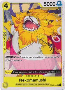 Playing O-nami doesn't net any DON!! directly, but it puts your opponent in a tough spot by giving your leader banish on the fly. Everyone loves life triggers, but banish steals that opportunity from your opponent. Kikunojo is difficult to remove, especially if your opponent's only option is K.O.-based removal. With 6000 power and 4 cost, Kikunojo offers endurance, similar to Rob Lucci from Set 5 Awaken the New World. Sanji is a valuable blocker for defensive play, while Nekomamushi can swing into active characters with the right DON!! investment. Cracker is a 5000 power character with a potential 7000 power and double attack if you have fewer life cards than your opponent.