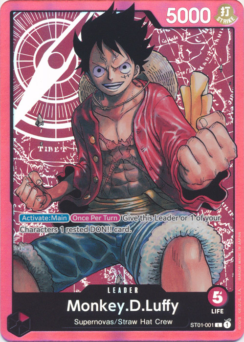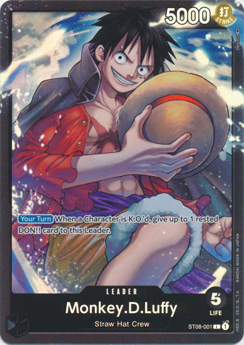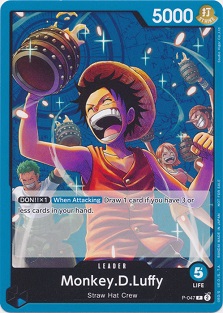 Luffy's experience throughout all of his adventures is reflected in the many different-colored Luffy leaders. From the Set 1 Red/Green Luffy leader to even the promotional Blue Luffy leader, he remains flexible, able to expand his horizons toward other strategies within the One Piece Trading Card Game.