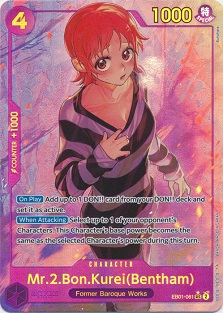 Without any further interruptions or speculations, lets get started on our Top 3! Starting off our list is the loyal-to-the-end Mr.2 Bon Kurei. Mr.2 is a unique piece within purple decks that doesn't seem impressive based on stats alone. Mr.2 is a 4 cost 1000 power with a +1000 counter and the ability of "[On Play] Add up to 1 DON!! card from your DON!! deck and set it as active." and "[When Attacking] Select up to 1 of your opponent's Characters. This Character's base power becomes the same as the selected Character's power during this turn." Your opponent has a 12000 power character? What do you know, so do you! Mr.2 has proven himself to be a power piece in decks such as Red/Purple Luffy, Foxy, or really any deck that dips into Purple. He gives you an extra DON!! on play and proves to be a versatile attacker, but he doesn't do much if your opponent doesn't play many characters. If your opponent plays few to no characters, Mr.2 may be better off pitched as a +1000 counter.