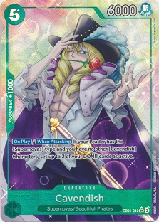 Leader Bonney has made her rounds and proven to be one of the most controlling Green decks in the game. Green has previously been known for playing midrange to large characters, resting down your opponents board, and getting rid of their threats by swinging into them. Bonney makes your opponents think about which characters to swing into and which characters might be rested once you swing in with your attacks. Cavendish makes for an excellent addition to this leader's deck with a cost of 5 DON!! And 6000 power and an ability that trigger both On Play and When Attacking that reads " If your Leader has the {Supernovas} type and you have no other [Cavendish] Characters, set up to 2 of your DON!! cards as active." Bonney Leader really only needs one DON!! to activate her ability, but a second DON!! never hurt anyone... except your opponents! It's also worth noting that Cavendish is not limited to just Bonney; Cavendish works within Red/Green Luffy leader, Red/Green Law and Green Kid.