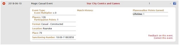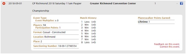 The Pauper Championship at Richmond did a bit of a better job overall, listing a lot more information. While I've removed them from this screenshot, it does also list the opponents I faced like a normal event. There's still one thing prevalent here: only one single lifetime Planeswalker Point was given out for my attendance of this event, even when I made it to the finals.