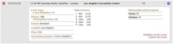 Because these are run as casual events, however, you only get that one lone lifetime Planeswalker Point. This is such a big deal because it doesn't count to your yearly Planeswalker Points total which grants you all kinds of benefits the more you have. If you have 1300 points in any given year you get one guaranteed bye at a Grand Prix and if you have 2500 points you get two byes instead. These points also used to qualify you for Nationals prior to Wizards nixing that event. Soon, though, they'll also qualify you for local Mythic Championship Qualifiers with 200 points needed per season.