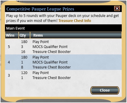 The first is the classic Qualifier Points, or QPs for short. Once upon a time you could get these points by playing the current Friendly Pauper Leagues only if you achieved a perfect 5-0 rating. That changed when Wizards began implementing the current prize payout of Treasure Chest boosters. When they phased out QPs from Leagues, there was quite literally no way to earn any playing the Pauper format for a number of months.