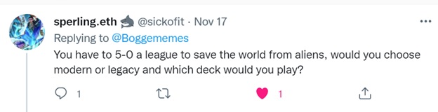 Matt Sperling's question is going to kick things off because I can share my favorite Modern and Legacy decklists. I also have the chance to save humanity from aliens. No pressure.