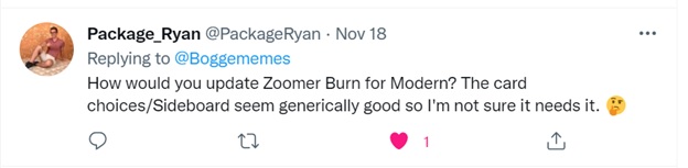 Burn is one of the many good choices in Modern. I prefer the Zoomer version of the deck despite seeing more Boomer versions having success.