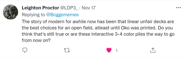 Modern Horizons 2 shook up the format by supercharging numerous archetypes. All of the decks in Modern's top tier are hyper-efficient which is able to create diversity. Why play a streamlined deck on everyone's radar when you can play a deck that has been temporarily forgotten? Modern Horizons 2 was FIRE done right. No one specific card is terrorizing the format because there are so many absurd cards printed recently.