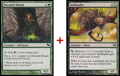 Oddly enough the student's name is Mike Flores. He discovered Magic one day when he was Googling his own name. In one of The Mike Flores articles he picked up the Quillspike / Devoted Druid combo. For those unfamiliar with this combo it’s pretty simple. If both are able to be tapped you end up with an Infinite Power / Toughness creature to attack with.