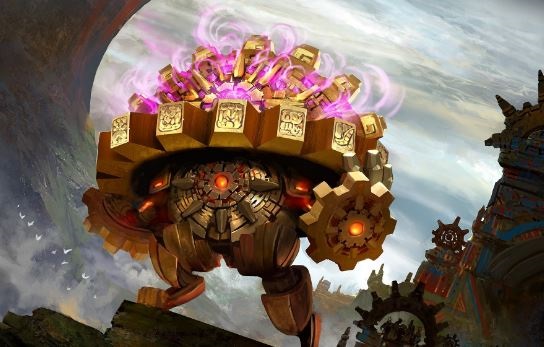 With the stage set, let's talk a bit more about Tetzin, himself. Looking at the whole of Magic's history, double-sided cards are a fairly new addition to the game, making their first appearance in 2011's original Innistrad. Since then, we've seen iterations pop up in multiple forms. Tetzin specifically wants double-sided Artifacts to functional optimally, narrowing an already shallow pool of potential spells. Note that both sides of a card need not be artifacts to work with Tetzin: only a single side, provided it's the one Tetzin sees when the card is played. Thus, although Treasure Map is a land on its back half, you'll most often be playing it as an artifact, causing Tetzin's triggered ability to fire. Just remember that once Tetzin flips into the Golden-Gear Colossus, he won't be able to flip that land back into an artifact.