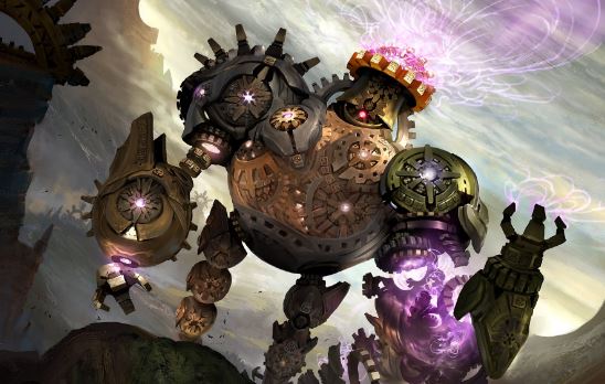 Within the lore of The Lost Caverns of Ixalan, Tetzin and Gnome brethren are the creations of the Oltec people, who dwell within Ixalan's core. After The Immortal Sun was stolen to trap Planeswalkers on Ravnica during War of the Spark, the various competing factions of the Ixalan (pirates, vampires, merfolk, and the human/dino partners of the Sun Empire) discovered a Lost-World-esque secret: their world's core had civilizations and a sun (Chimli, the Inner Sun) all its own. The surface-dwelling Sun Empire are actually the descendants of the Oltec, who've thrived via their mastery of the mysterious element Cosmium. This luminous mineral enhances magical abilities, providing immense power when harnessed correctly. The Oltec tattoo themselves with the material, extending their lifespan and overall vitality. Technology that incorporates Cosmium is extremely resilient, virtually immune to wear and tear. Vampires can even feed on the material as a blood-substitute. All these uses naturally makes the resource of tremendous value to the factions from the surface.