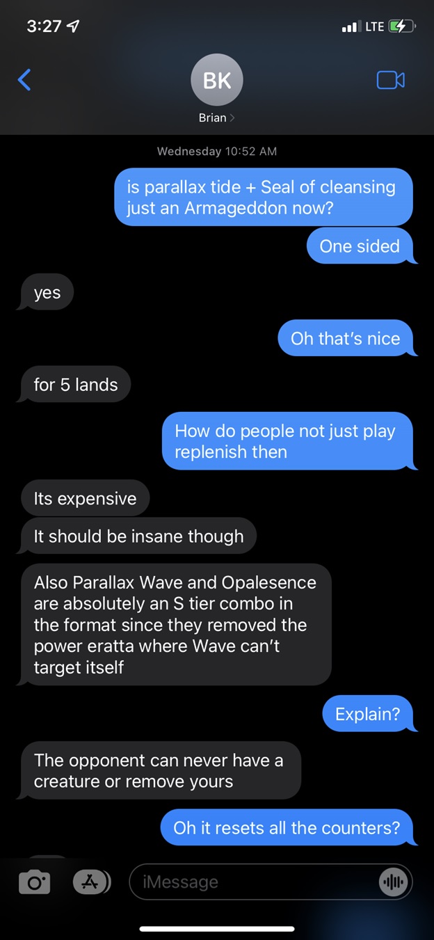 When first breaking the ice on the format way back in November, Kowal had told me that "power level errata" [whatever that meant] on Parallax Wave and Parallax Tide had been reversed. Because no one played the cards, WotC didn't want to waste confusing digital space managing text from a Standard format 22 years gone that wasn't making Legacy or Vintage sixties. I pretended I knew what he meant and consigned myself to playing something with basic Mountains up until about... Wednesday.