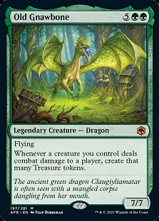 Let's get the elephant - or rather the seven-mana Dragon - in the room out of the way first: Wow that special ability. This isn't just Old Gnawbone hitting an opponent. It's anything. So, if you had six power in play prior to Old Gnawbone (maybe for some Pack Tactics), you'd exit the next combat with six Treasure. Old Gnawbone itself is an engine. Cast it; somehow untap with it; hit with it... Boom, seven Treasure. That is amazing if they let you do it.