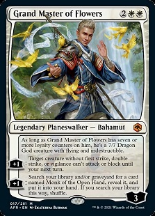 The knock on many Planeswalkers is the inability to protect themselves. Kind of tongue-in-cheek all Grand Master of Flowers can do is protect himself! I love that you can search your graveyard for Monk of the Open Hand. That will allow you to keep ramping the Grand Master up even after earlier acolytes have died defending him.