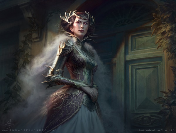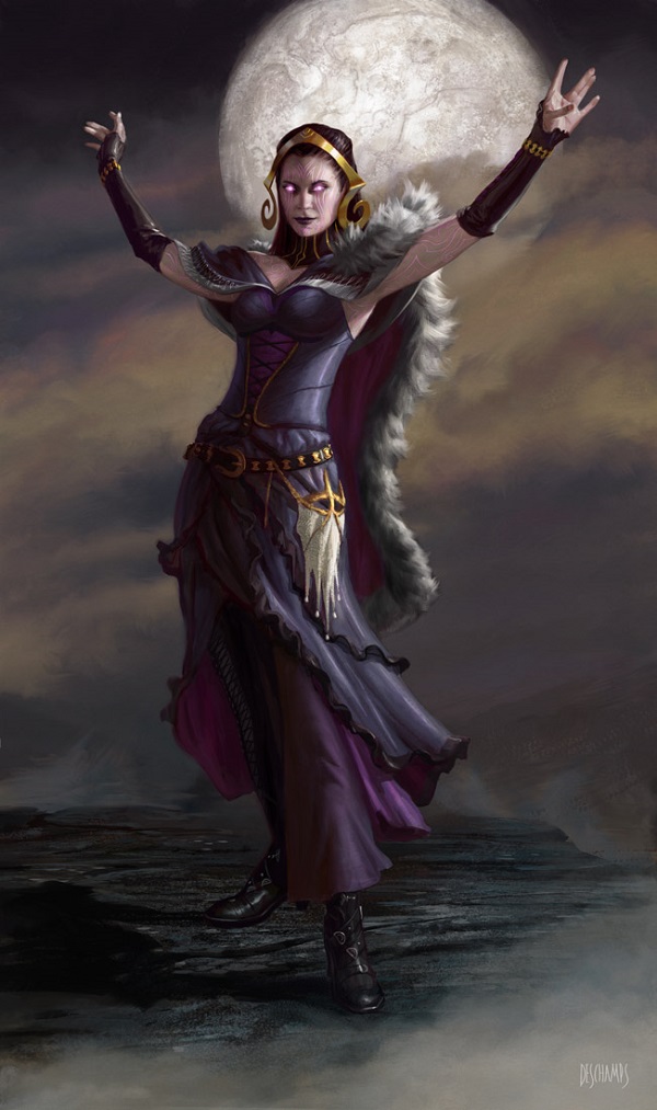 Compared to Liliana of the Veil, with shoulders pushed back to accentuate her chest, this seems considerably quieter both in dress depiction, but also in stance. It’s not inviting, we are not gazing, ogling her, but rather, given a light source on the chain veil and her triumphant pose. She stands in post spell resolution, with the dust moving around her to her will, in front of Innistrad’s moon, holding no swag over her influence and power.