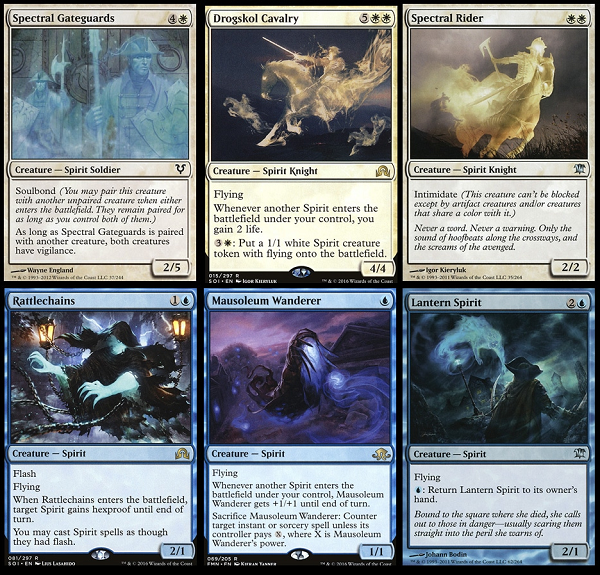I worked on the Dark Ascension set and there was an entire section on spirits in the style guide. The Planeswalker Guide to Innistrad explained on it briefly. Notable is that each color differed in the type of spirit, obviously, from ancestry to attack spells and so on. Concept altering with the Drogskol Cavalry here is that Bodin didn’t quite follow the color depiction of spirits. Look below to see the White spirits being gold/yellowish in color, with some exceptions. Normally the translucent blue or turquoise was associated with the Blue aligned geists or spirits, though no longer uniform.