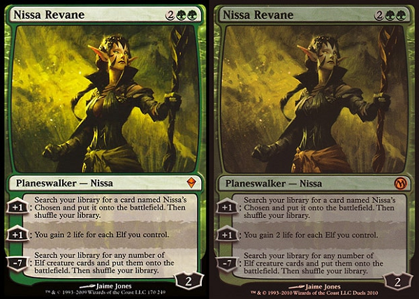 I love limited palettes of colors. With white, green and yellow as the only colors a Green deck fits perfectly with the visual look along with the emotive connotations it brings of plant growth. Life is even emoted through the bent branches, showing us growth and life to align to the mechanic perfectly. The flowy hair adds to the organic nature that the original doesn’t quite have as all aspects aligning to one mechanic - growth of mana and in this case, forests, or plants.