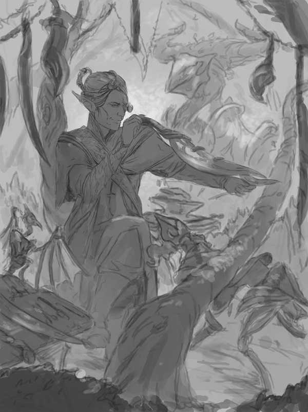 I had some help finding this image and I’m happy I did. What could’ve be seen is now clear. Izzy remvoed the chains on the hands of the souls in the original and instead quieted the scene in the marsh. He showed nostrils, which are horrifying, like lips to a wurm. It adds to the concept creature creation and ups the creepy factor.