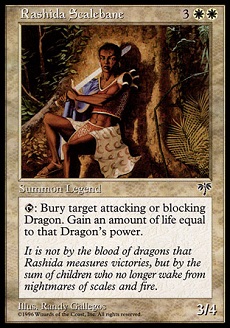 As for Rashida, she was the military presence compared to the mystical aid of Asmira. Her ability of killing dragons was actually changed in the errata to prevent even regeneration of the Dragons! It’s just an absurdly flavorful and powerful ability. In the storyline, she actually had the heads of the killed dragons brought with her army. Neat stuff. She was with Asmira to free Mangara. Dive into the novels or the MTGSalvation wiki to learn more. I’ve hyperlinked to their profiles.