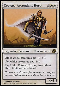 Crovax was in a lot of cards as The Weatherlight Saga spanned many sets—cards such as Ascendant Evincar, Death Stroke, Massacre, and Whispers of the Muse, and he had a Vanguard card as well.