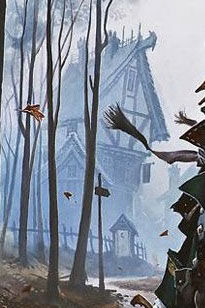 A quick note on Innistrad's visual gag: We are not to assume this city hall, township, or "Rathaus" is bent upward. The "gag," as the art directors call them, is that humans were looking with a "first-person camera" on Innistrad to encourage a sense of personal dread. When you see a Stensian castle, you look at it if you were the human. You look up. Same goes for all the other buildings in Innistrad's first block. We will see if they fully maintain this perspective on our second visit.
