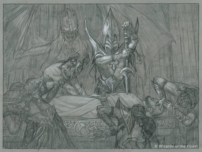 I’m not entirely sure why more people aren’t talking about this card. It has everything Rahn exemplifies: great usage of light, soft horizons, strong foreground figures, and interesting details. I love this piece, and I won’t lie—I’m a little saddened that he didn’t put this one to public auction and instead sold it to a private collector. It’s magnificent and since it’s a dragon tutor for the Commander format—it will be seen and probably reprinted for years.