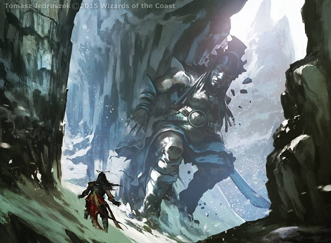 Aleksi can draw epic Planeswalkers. He came to Magic and received them nearly immediately. The frame allows for an incredible amount of detail and interested elements to fill the background. He stands by Ugin’s cocoon/tomb, placing him in a storyline-significant area, and it doesn’t look tacked on. There’s a giant dragon over his shoulder, and it doesn’t fight the focus on the card. Everything is so simple, so effortless in his execution. We’ll see the art awards this will win within the year.