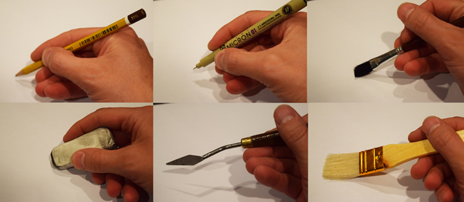 With traditional art, you have a different tool for everything. You have a fishing toolbox in college when you carry along every implement you might even remotely use, from ink and pencils to erasers and a variety of paintbrushes. You learn how to clean brushes, use turpentine, clean paint off your beard, and get it out of your hair and off your dog.