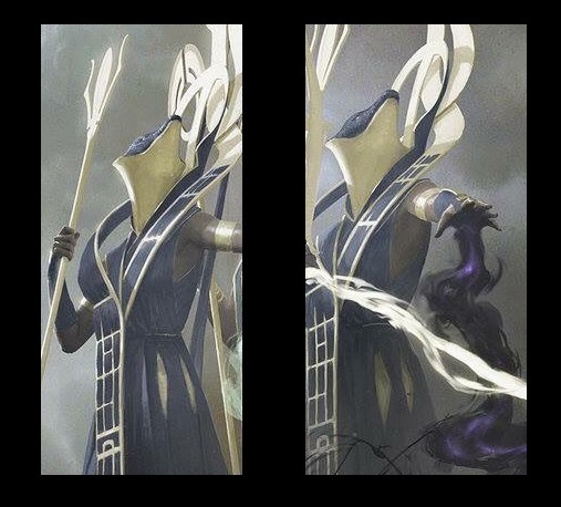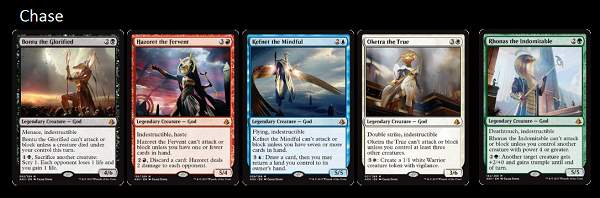 But, did you see how the “front” god serves as the “main” part of the spell. Just as destroying permanents is very possible in White, especially non-White colored ones, it makes sense that Oketra would “lead” with Bontu playing back up.