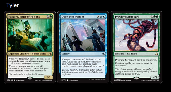 Ultimately, it’s a beautiful work that builds off Tyler’s previous award-winning Exalted Angel by adding soft linen drapery to her vizier’s legs, giving us yellows upon greens and whites, matching the light sources and minimizing the color palette for shadow. Luckily it’s a legendary creature, making the replayability value high for this artwork to be seen outside the Standard format, serving as either a -1/-1 counter or snake commander. One would hope great art would be seen more, right?