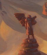 This piece stands as exceptional for an idealized, incredible figure painted with thick brushstrokes, as if Dave is telling us "yeah, it's Egypt but I don't care, look at this magnificent man." He blocks in the color and darkens the floating obelisks at the top of the painting, drawing your eye upwards at this staff, at this triumphant moment. Again, they have a 2x3" box to put art in, having a strong movement effect is much, much harder than it appears.