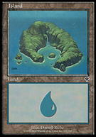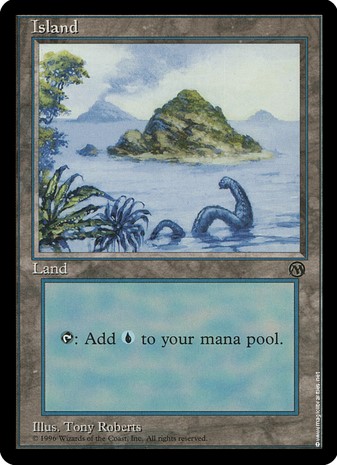 This painting is from the Arena League promo program. The league was an incentive program of sorts that brought kitchen-table players into competitive play without professional DCI play. They were really run by stores, open to giving out promos with whatever format their players liked. It was all about quantity of events, and to make it more attractive, they gave out these promos. Tony Roberts painted a panorama that spanned all five lands, and a Wizards employee snap-bought it even before the cards were released. (Grumble! I want that artwork!) The lands worked in that you'd receive one at the start of each season, and the top players would receive a Disenchant or a Fireball. These incentive programs were rampant in the 1990s from Arena League to the Guru program, and the promos, like this little Island, were prizes.