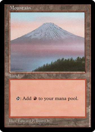 One day, I'll upgrade all my purple mountains to Mount Fujiyama here. This card is from the APAC set of lands in the clear booster, being set three. APAC (Asia–Pacific) lands were alternate-art lands that were only available to people living in the Asia–Pacific region by purchasing a box of Tempest. They were the buy-a-box promos of their day. The cards were available in three packs: red, blue, and clear. The artwork features scenes from around the Asia–Pacific region.