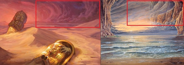 In writing an art description for any TCG, the art box is at best 2.25 x 3.25” (~50x70mm) and instant recognition, readability should trump place. Meaning, a spell doesn't need pyramids and the Bolas horns to be read as a spell. It also doesn't need sand for people to grok that it is Amonkhet and not Mirrodin. Stripping away the unnecessary is no longer expected to make a tighter image, a better artwork.