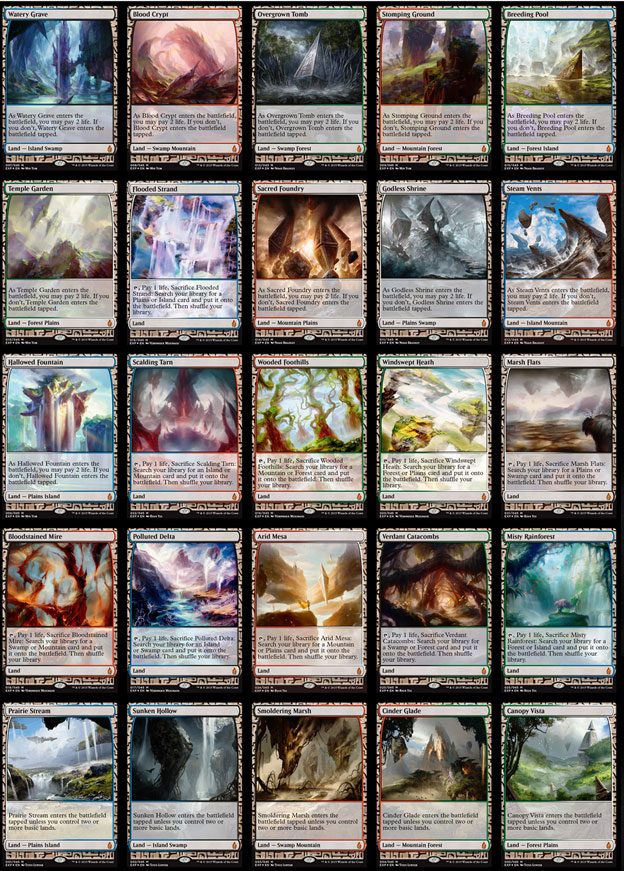 Finally, we reach the meat of Zendikar and their original visual gag itself: It’s a set about land, where it matters. The new lands are mighty pretty, continuing the theme of land as lush visual site, not so much a mana-producing thing. In fact, it’s been a few years since we saw any “mana” actually flow or come from a land. We’re seeing still images and the original intention that it actually does something is no longer explained and rarely shown outside of Commander sets. (Those sets will have rainbow colors or mists serve as this creation, most commonly.)