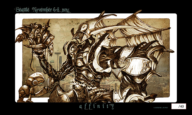 He’ll have prints, his own personal line of play mats, a book called Fantasy Genesis with gaming dice, and some samples of his sketch work of really whatever you’d like. Since he’s an art instructor for a Character Design class at the Pacific Northwest College of Art, he has a few tricks up his sleeve for the Battle for Zendikar crowd. I heard something about Planeswalkers, so keep an eye open for what he’s up to.