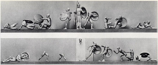 It was built circa 500 BCE and had depictions of the two Trojan wars. Midcombat is just easier to depict, as it cannot be confused for anything else. You can see the original depiction, painted with gaudy color and what are the only things left, below.
