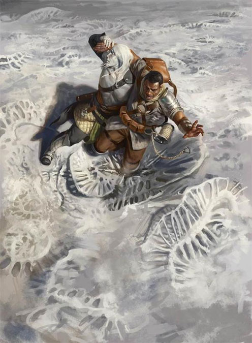 We see some traditional scenes of war on Zendikar, included salted earth and burnt fields on the nonbasic lands in the forms of white chalky annihilation of Ulamog's brood. The devastation is there, but many aspects of war aren't seen. We haven't seen the aftermath much; it's all so current. Some of that is a necessity of showing a figure for a tiny box that needs to describe an Elf Shaman instead of a narrative on how the Zendikari are doing in the war.