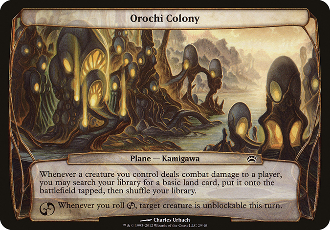 Touching on one thing in the background—one of my favorite images from Planechase—is the Orochi Colony by Charles Urbach. It’s just a conceptual knockout, showing living spaces as eggs. By Aaron including them, it gives you a second confirmation that this is indeed Kamigawa.