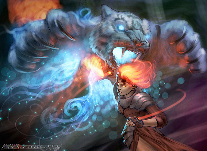 I couldn’t quite tell if the illusion was basic in some type of water, wind, or ice magic, but it’s all irrelevant in the end. It’s a great cat face, a strongly influenced Legend of the Five Rings figure, and a great little sketch that didn’t see print! Steve does try to include as many Easter eggs, in-game expansion of Planeswalkers, and additional explanations as possible. I always love that. It’s never just a painting and a shrug. It’s delightful.