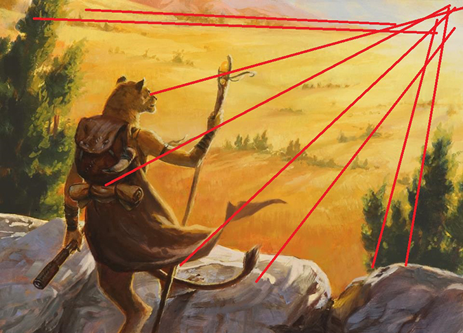 I love the east-horizon vanishing point, as showcased below. It’s just a little extra flavor for you if you’ve studied just a smidgen of constructing a scene and want to see some more of Theros’s countryside.