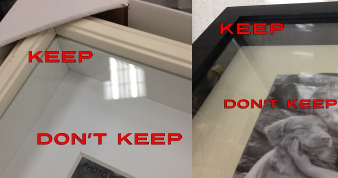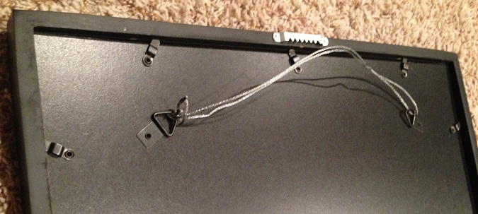 When you buy a cheaper frame like something at Target, you'll see a back that looks like this. I've added two types of framing devices to it. When you walk into the duct tape/3M aisle at Target, there should be little framing kits that look something like the twenty-pound weight kit shown here.