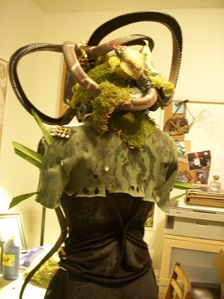 Adjusted snakes to be more balanced on crown. Added premade cardboard skull to front of headdress to act as a lift for smaller tentacles I might add in the future. Also, a flavorful addition that added to the look of “completeness” for the costume.